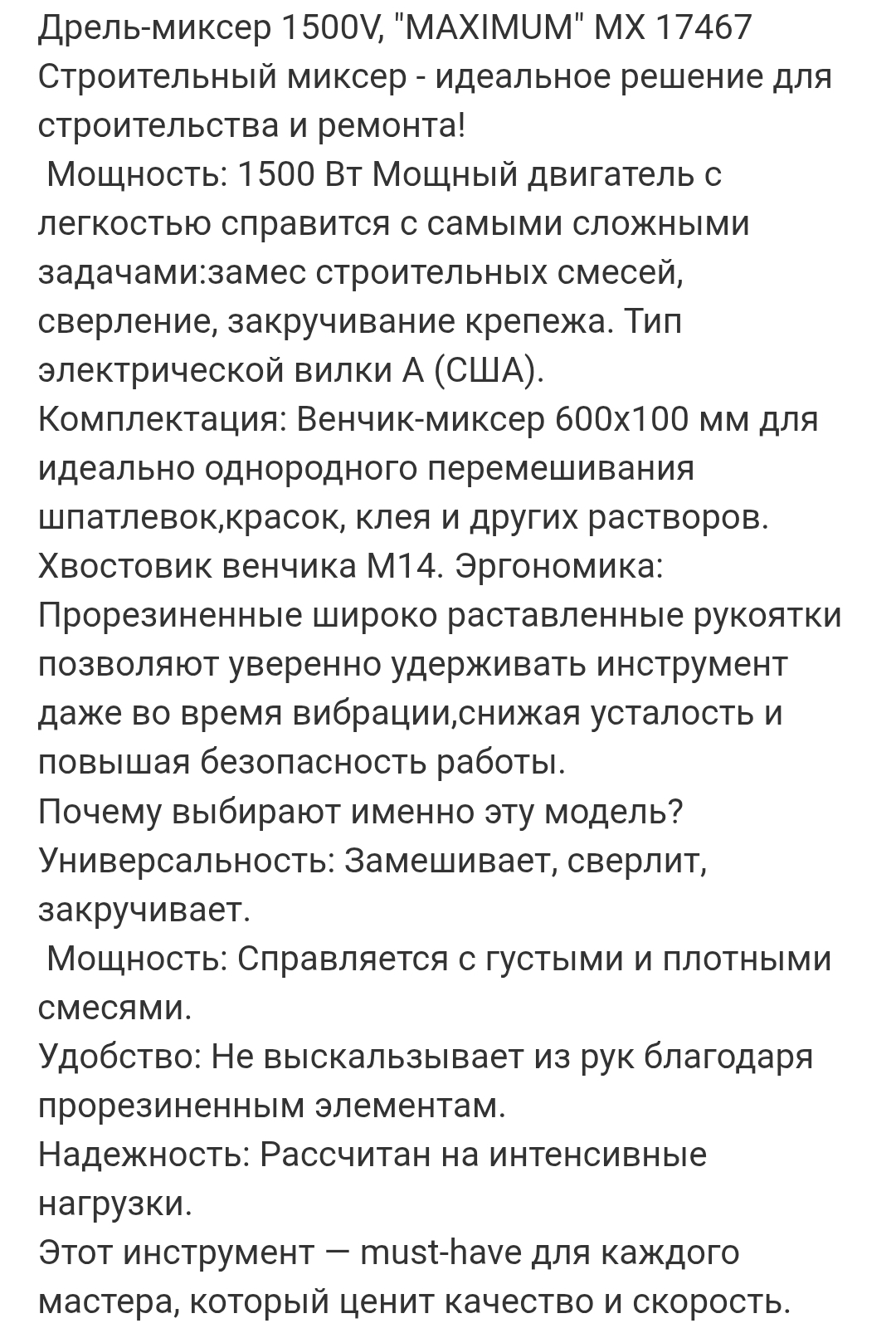 Мощность: 1500 Вт Мощный двигатель с легкостью справится с самыми сложными задачами:замес строительных смесей, сверление, закручивание крепежа. Тип электрической вилки А (США).