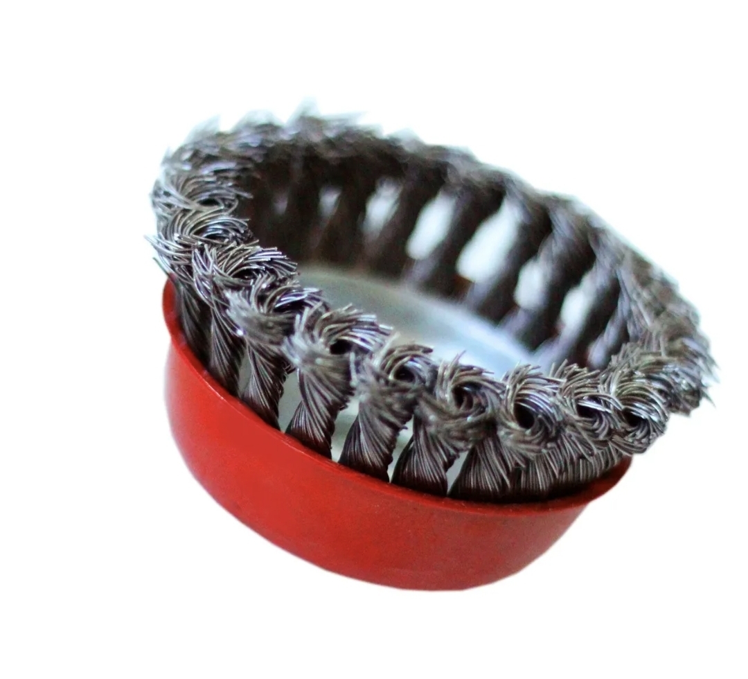 Чашечная щетка 100 мм — сменный элемент для угловых шлифовальных машин. Применяется для шлифовки, полирования, зачистки от лака, краски и коррозии различных поверхностей. Тип крепления - М14, Max RPM - 3750.